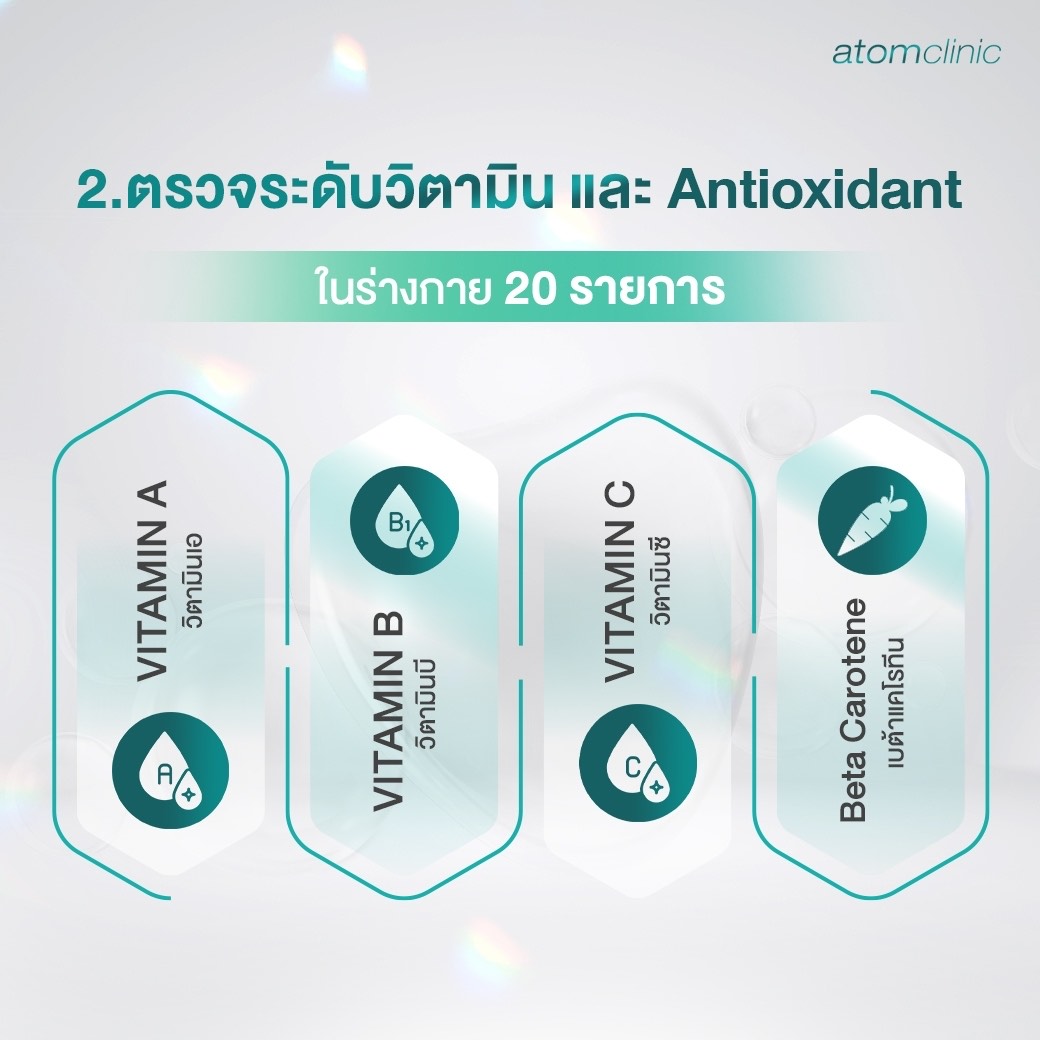 โปรแกรมตรวจระดับวิตามิน และ Antioxidant ภายในร่างกาย เป็นการตรวจระดับวิตามินและสารต้านอนุมูลอิสระในร่างกายเป็นสิ่งสำคัญเนื่องจากการขาดแคลนสารอาหารที่จำเป็นสามารถส่งผลกระทบต่อสุขภาพได้ การตรวจเหล่านี้จะช่วยให้ทราบถึงสภาวะร่างกายและสามารถปรับเปลี่ยนอาหารหรือรับวิตามินเสริมให้เหมาะสม