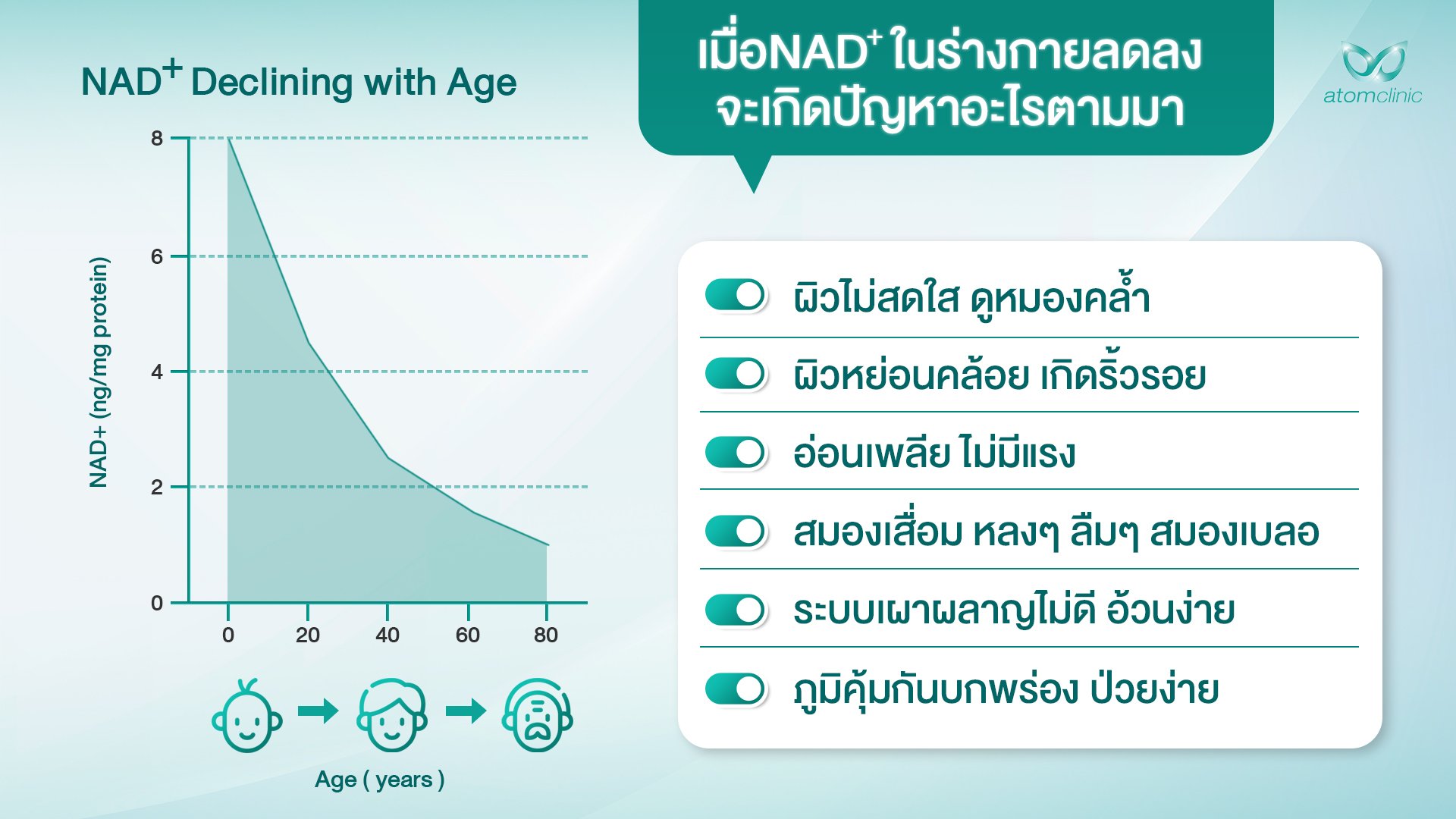 ระดับ NAD+ จะลดลงตั้งแต่อายุ 20 ปีขึ้นไป ในวัยกลางคนอายุ 40 ปีขึ้นไปจะลดลงเหลือ 50% ทำให้เกิดความเสื่อมของวัย เมื่อมีอายุ 80 ปีจะลดลงเหลือเพียง 1% - 10% การลดลงของระดับ NAD+ จะก่อให้เกิดการ ความชราของผิว เสื่อมถอยของระบบประสาทความจำ ระดับการ เปลี่ยนแปลงพลังงานลดลง เกิดภาวะของโรคตามอายุขัย เช่น โรคหัวใจ โรคอ้วน ภาวะมีบุตรยาก ปัญหาอื่นๆ