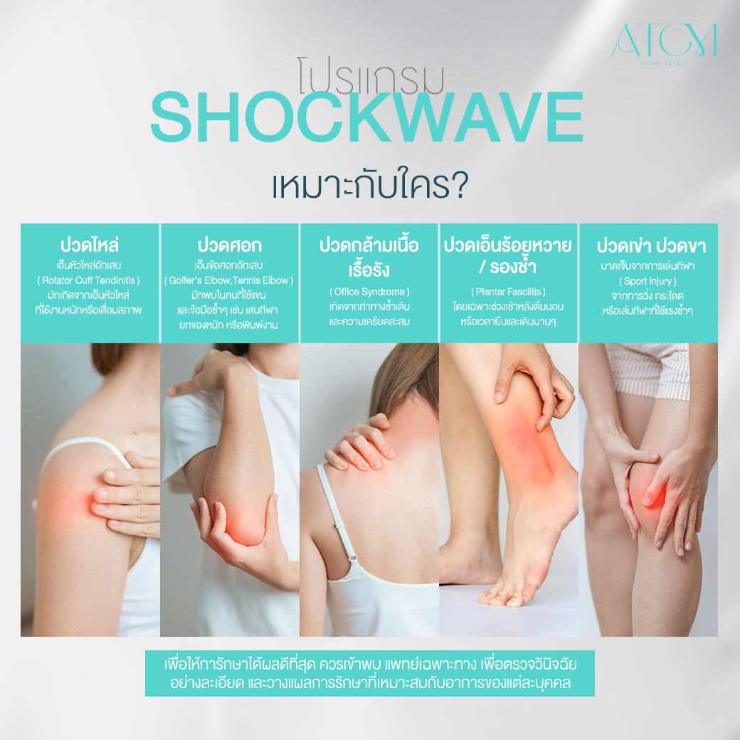 Shockwave Therapy จะส่งแรงสั่นสะเทือนลงลึกถึงเนื้อเยื่อ เพื่อกระตุ้นการสร้างเซลล์ใหม่ กระตุ้นการไหลเวียนโลหิต และลดการอักเสบ เหมาะสำหรับผู้ที่มีอาการปวดกล้ามเนื้อ ข้อ และเส้นเอ็นที่เป็นมานานและรักษาด้วยวิธีทั่วไปแล้วยังไม่หาย