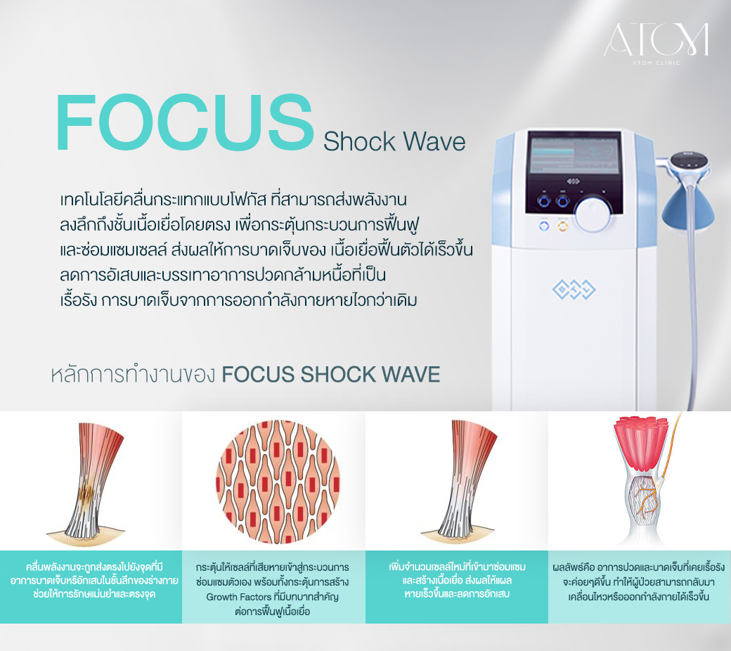 Focused Shockwave – พลังงานสูงและลงลึก เฉพาะจุด เหมาะกับอาการเรื้อรัง เช่น พังผืด หรือหินปูนเกาะเอ็น